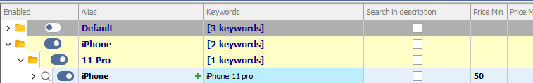 - Enable/Disable All: Each folder can enable or disable all keyword search terms within it at once