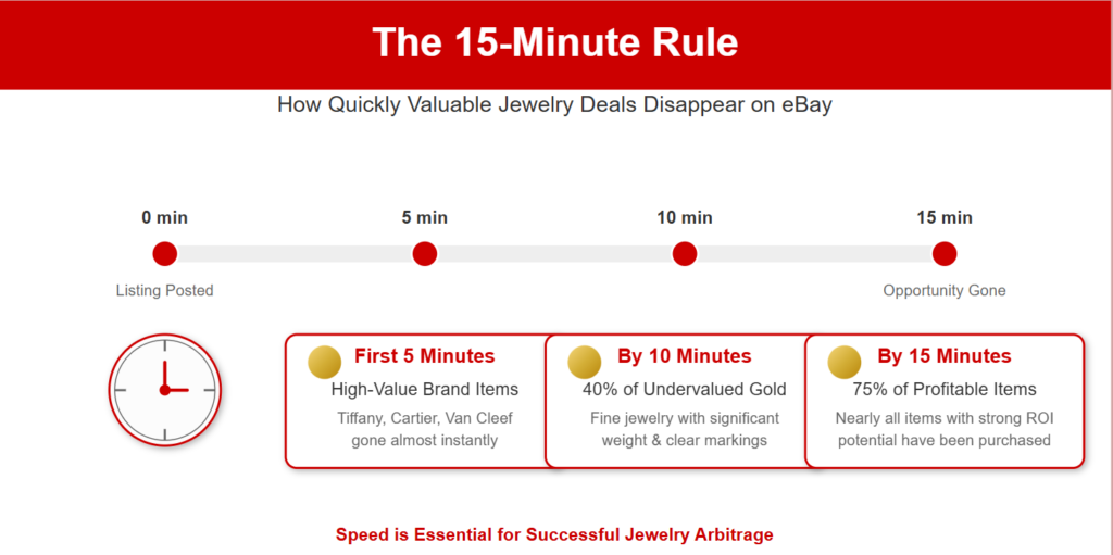 Manual searching can’t compete with today’s market velocity. With over 10,000 jewelry listings appearing on eBay daily and many disappearing in under 15 minutes, automation is the only way to stay competitive.